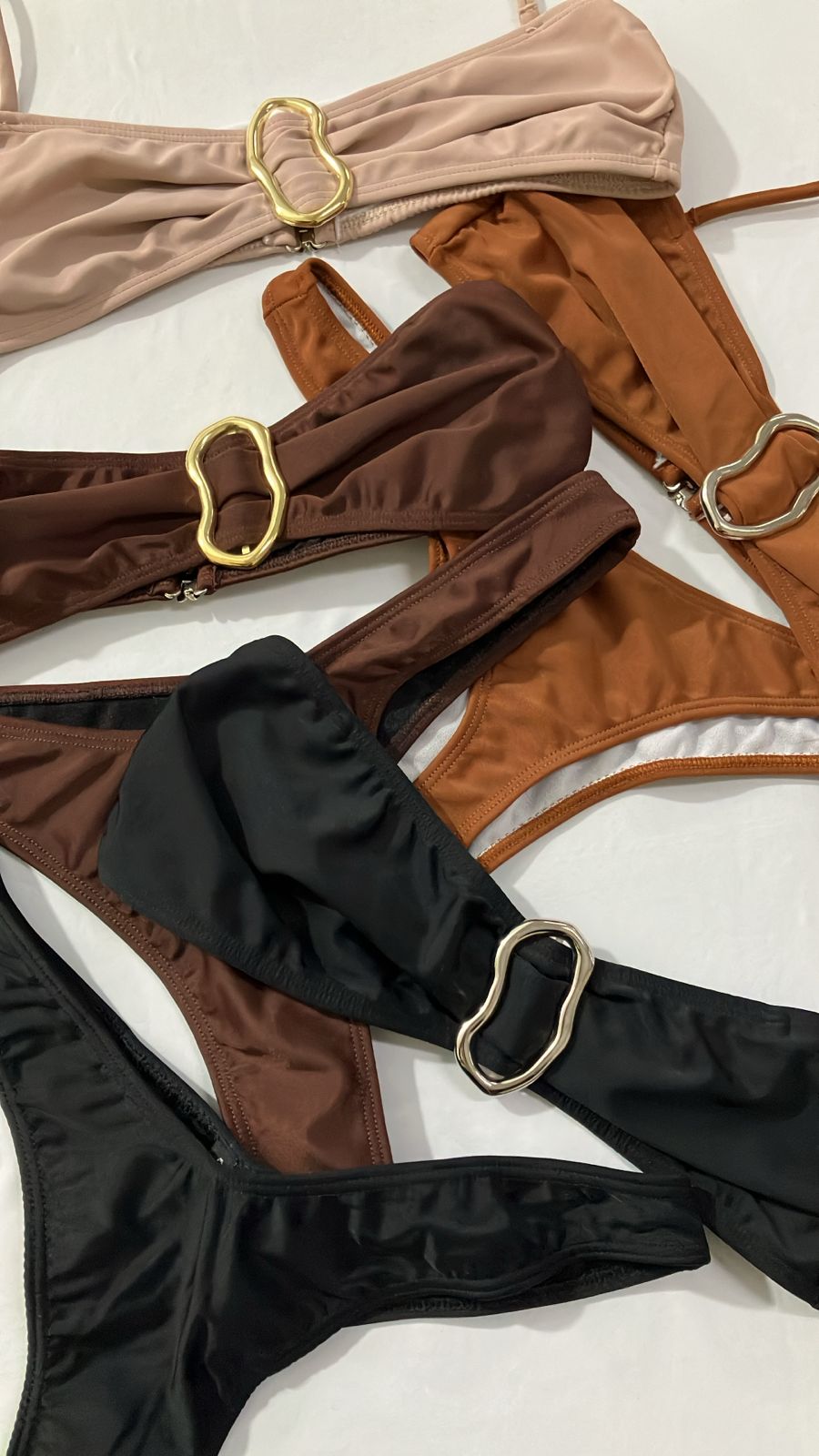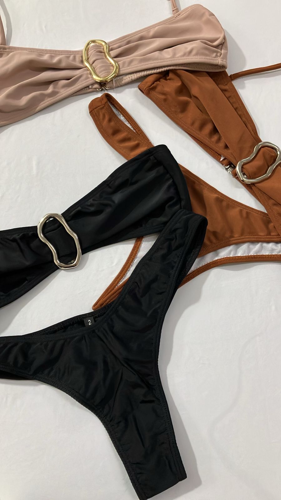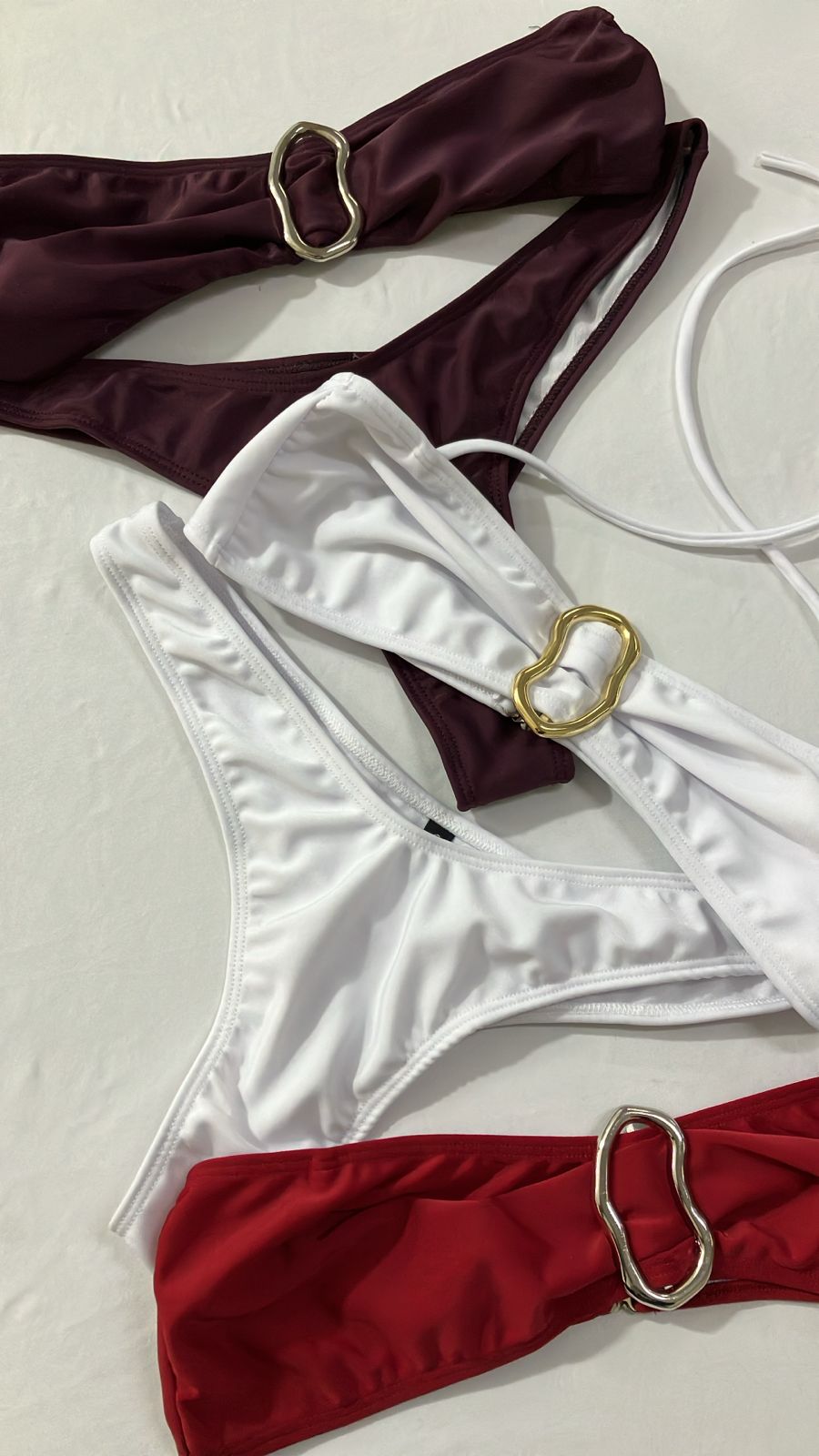 Bikini top con argolla dorada o plateada en el medio , y colaless en V